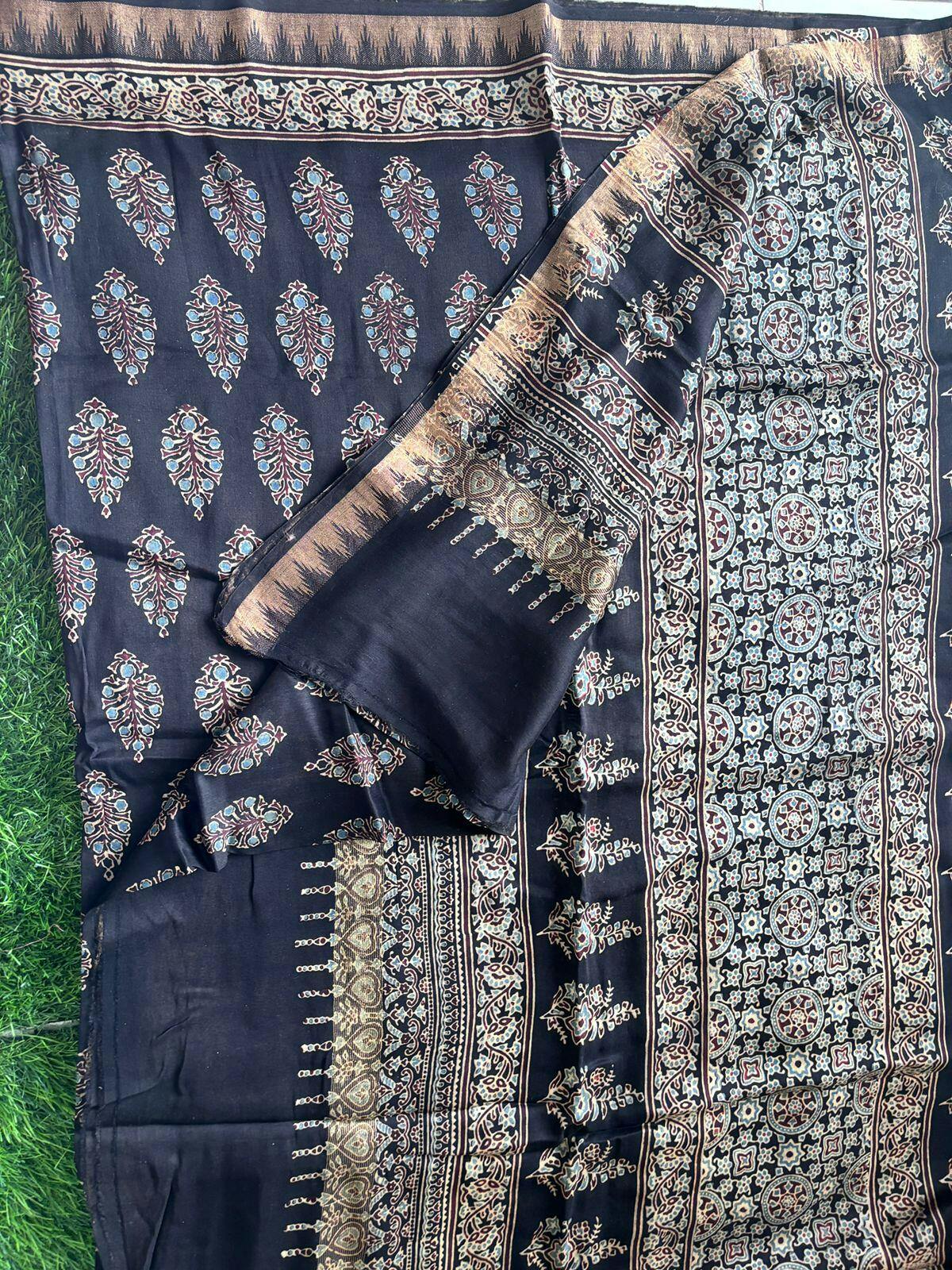Celebrate the richness of Indian textile heritage with this Maheshwari Saree adorned in authentic Ajrakh handblock print, a timeless art form known for its deep, earthy colors and geometric motifs.