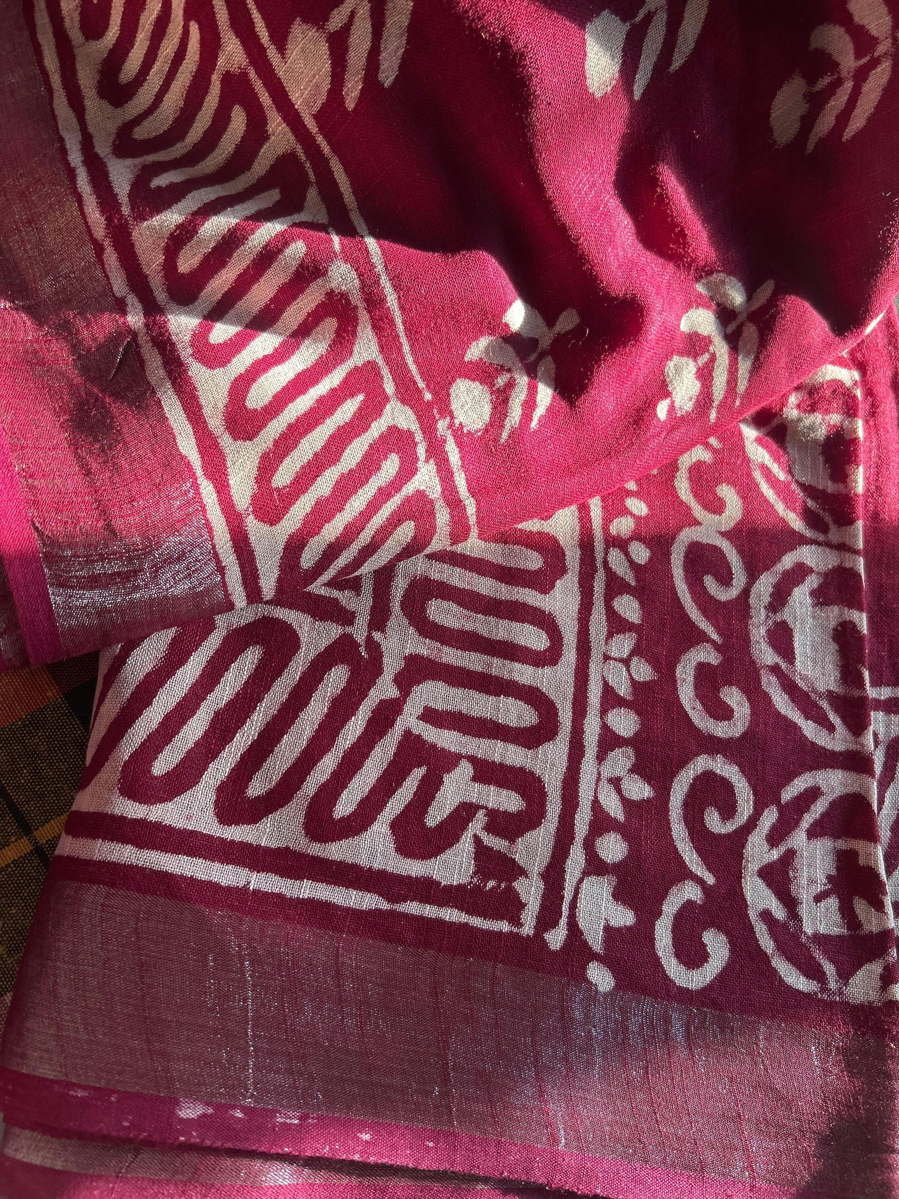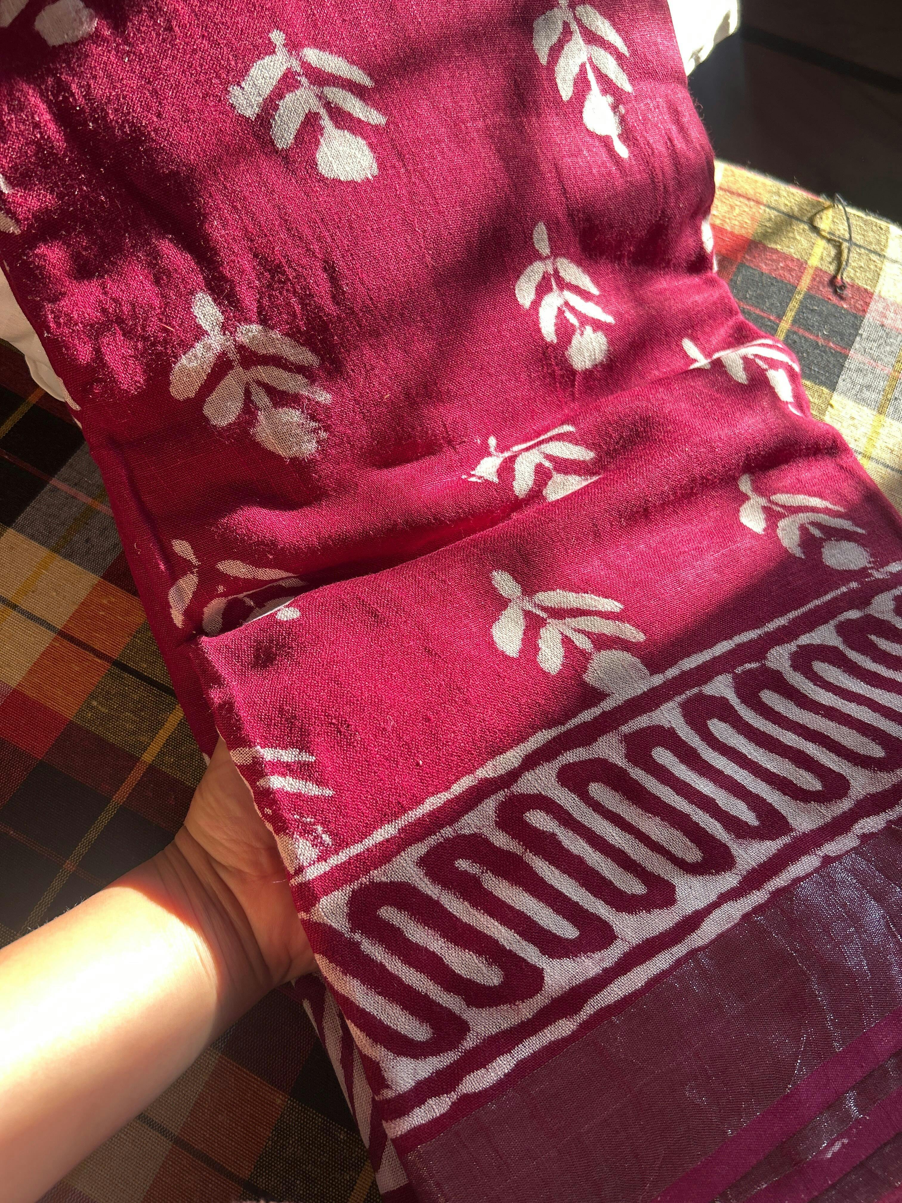 Experience the perfect blend of comfort and style with our Linen Cotton Handblock Printed Saree, paired with a matching blouse. This stunning piece combines the natural texture of linen and cotton, showcasing traditional handblock printing techniques.